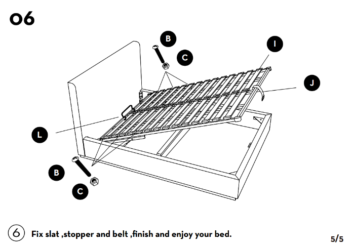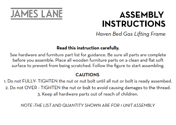Before assembling your Haven Gas Lift, check that all parts, hardware, and tools are included. Place components on a soft, clean surface to prevent damage. Attach the headboard, footboard, and side rails using the supplied fixings. Install the lift mechanism and central support beam according to instructions, ensuring smooth operation. Secure all bolts firmly without over-tightening. Place and lock the slats into position. Double-check all connections before attaching the mattress. Your Haven Gas Lift bed is now ready for safe use.