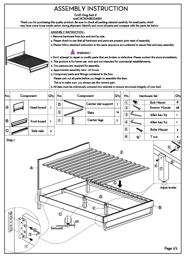 Before beginning assembly of your Croft bed (King/Queen), ensure all parts, fittings, and tools are included. Place components on a clean, soft surface to prevent damage. Attach the headboard and footboard of the Croft bed (King/Queen) to the side rails using the supplied fixings. Install the central support beam, if applicable, for added stability. Secure all fittings firmly without over-tightening. Evenly position and secure the slats across the frame. Check all connections before placing the mattress. Your Croft bed (King/Queen) is now ready for use.