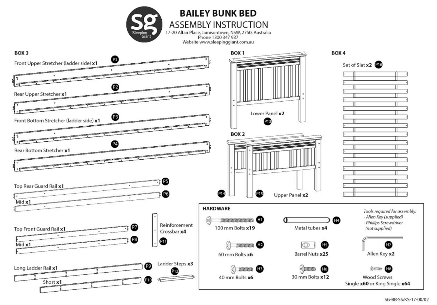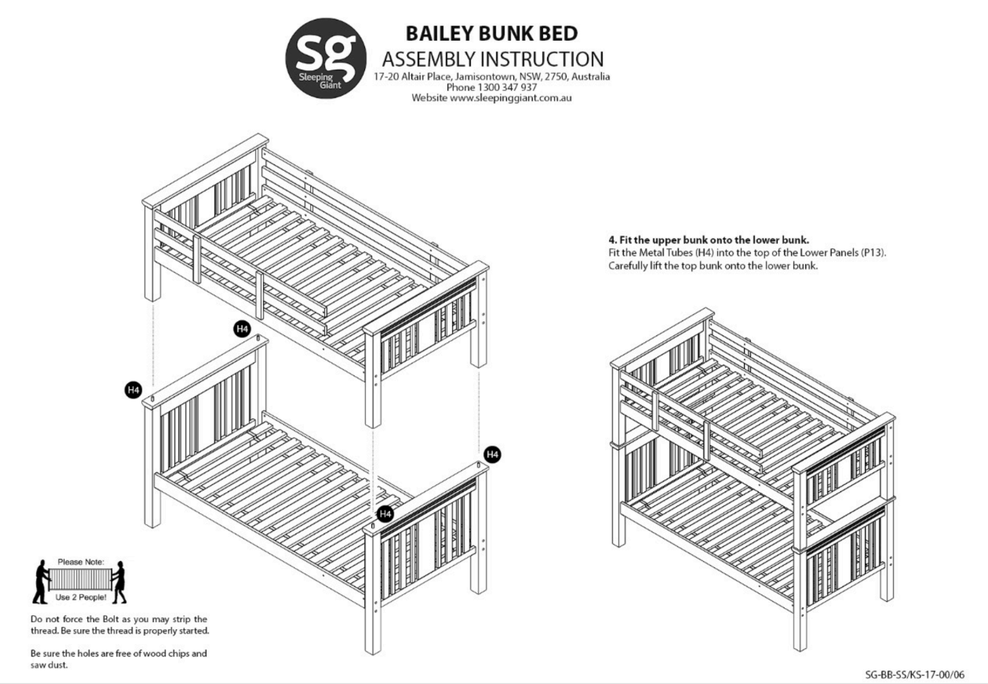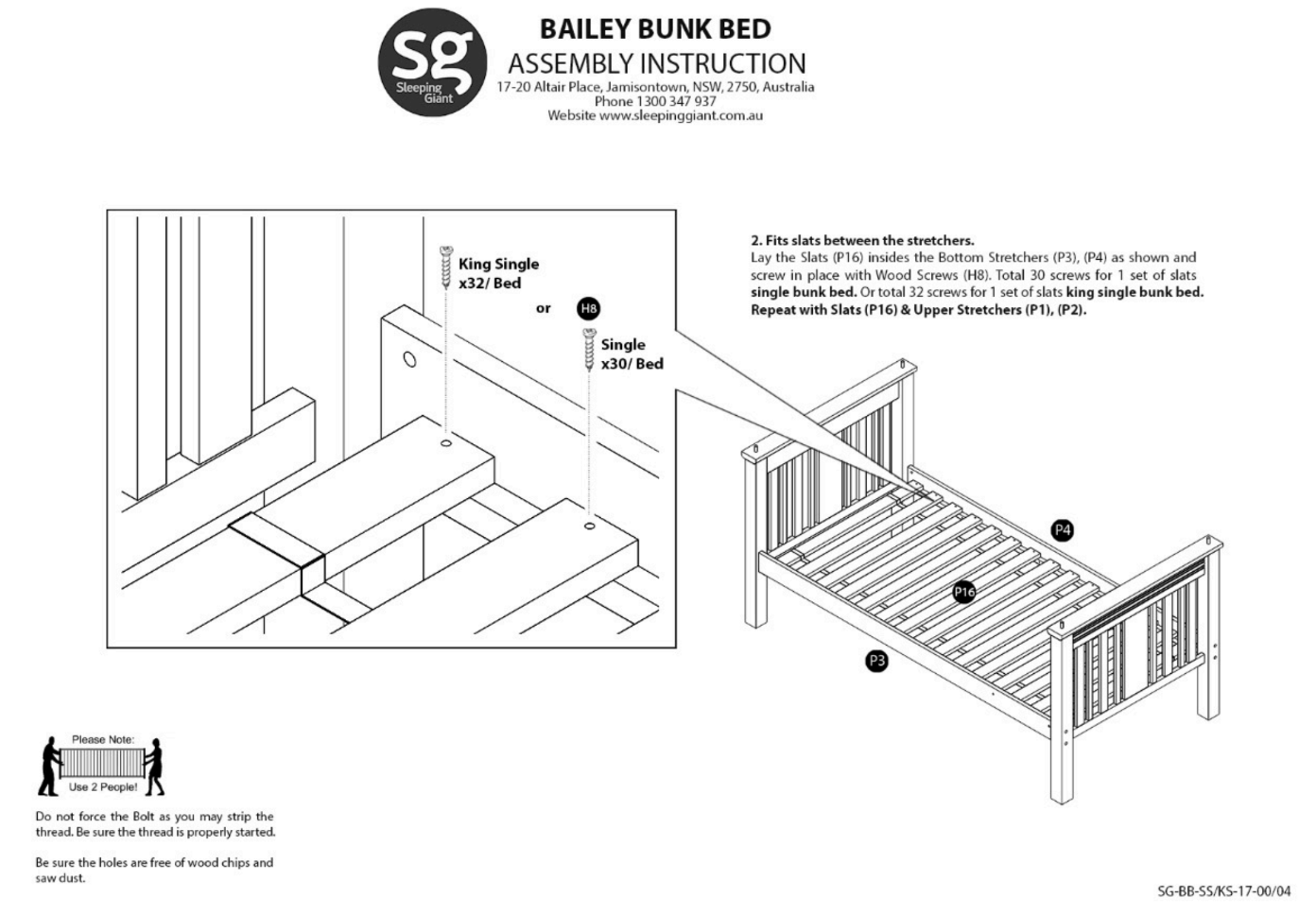 Before beginning assembly of your Bailey bunk (single & single), ensure all parts, fittings, and tools are included. Place components on a clean, soft surface to prevent damage. Attach the headboard and footboard of the Bailey bunk (single & single) to the side rails using the supplied fixings. Install the central support beam, if applicable, for added stability. Secure all fittings firmly without over-tightening. Evenly position and secure the slats across the frame. Check all connections before placing the mattress. Your Bailey bunk (single & single) is now ready for use.