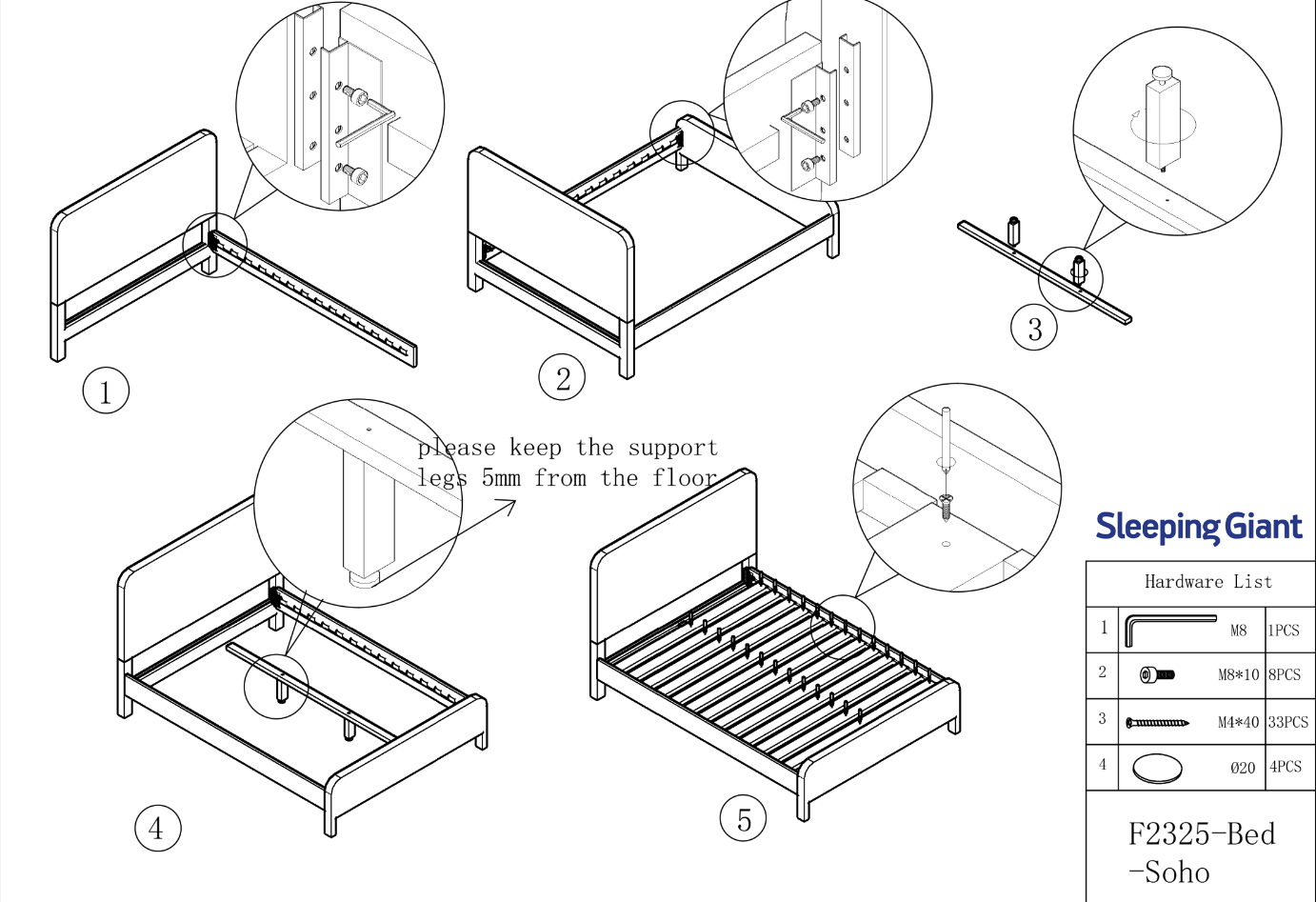 Before beginning assembly of your Soho Bed, ensure all parts, fittings, and tools are included. Place components on a clean, soft surface to prevent damage. Attach the headboard and footboard of the Soho Bed to the side rails using the supplied fixings. Install the central support beam, if applicable, for added stability. Secure all fittings firmly without over-tightening. Evenly position and secure the slats across the frame. Check all connections before placing the mattress. Your Soho Bed is now ready for use.