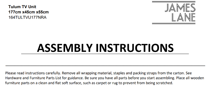 Before assembling your Tulum TV Unit, ensure all parts, shelves, and fittings are included. Place components on a soft, clean surface to avoid damage. Attach the side panels, base, and back panel using the supplied bolts and washers. Install any central support beams or shelving according to instructions. Tighten all fixings securely without over-tightening. Ensure the unit is level and stable before placing the TV. Your Tulum TV Unit is now ready for use.