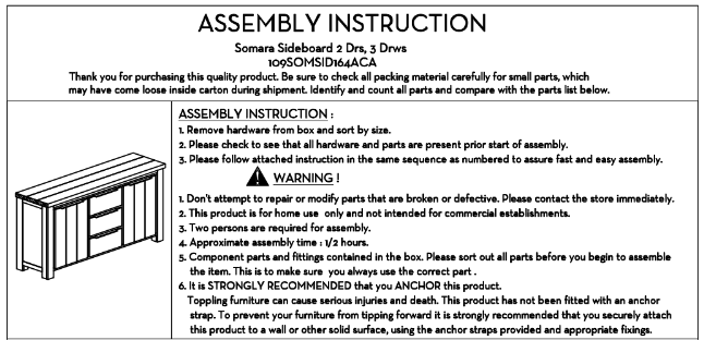 Before assembling your Somara Sideboard Table, check that all parts, drawers, and hardware are included. Place components on a soft, clean surface. Connect the side panels, base, and top using the supplied fixings. Install internal shelves or drawers following instructions, ensuring smooth operation. Secure all bolts firmly but avoid over-tightening. Check that the buffet is level and stable. Your Somara Sideboard Table is now ready for use and display.